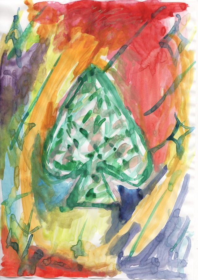 水彩、ペン、紙 2020 210×297 mm a4サイズ トランプをモチーフにしたドローイング(スペード)です。 コピー用紙に水彩絵の具で描かれています。 ふしぎな輝きがあります。 このドローイングは全40種類あります。