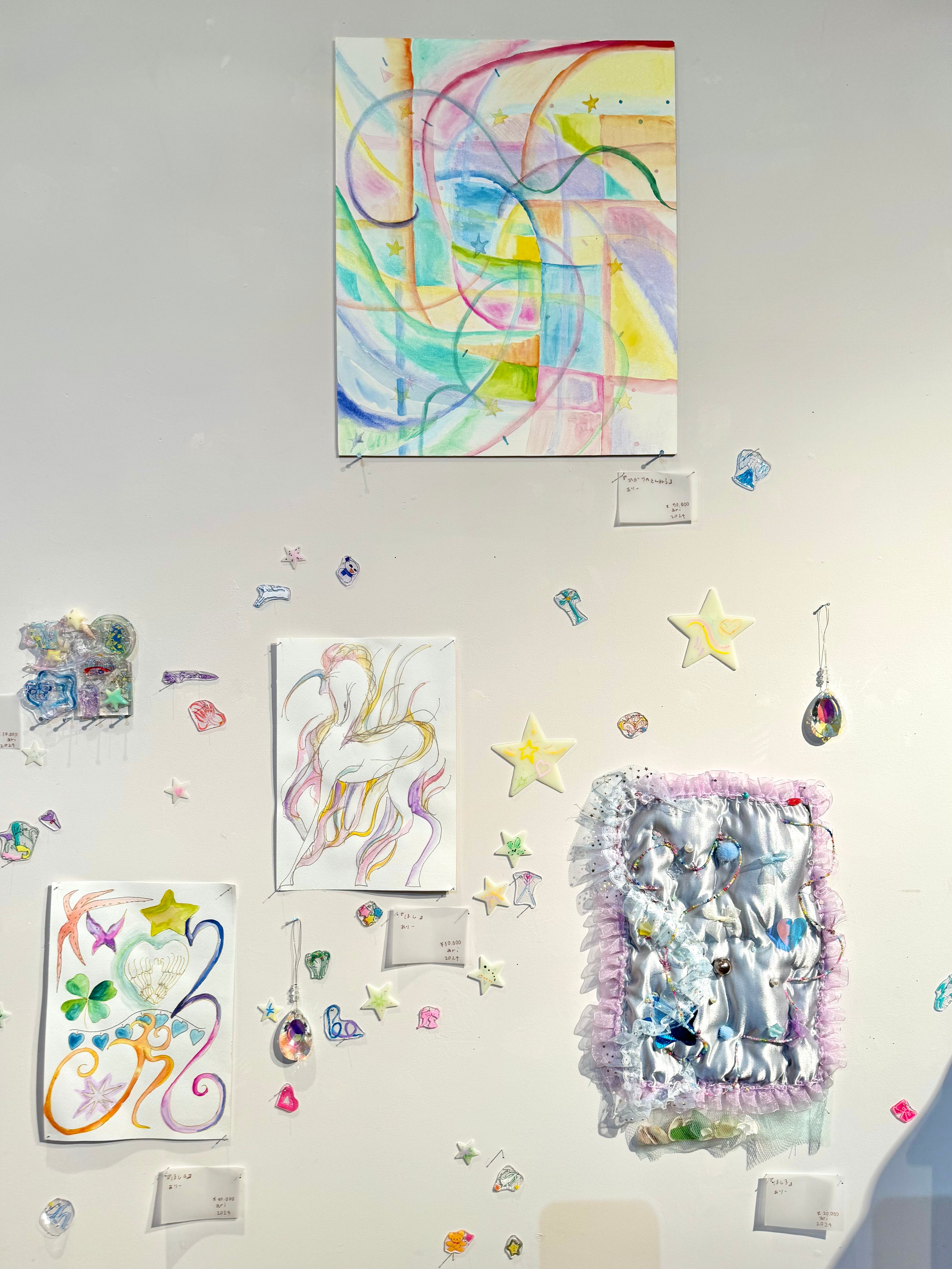 グループ展『parktopark』に展示された絵です。画用紙に水彩絵の具とキラキラペンで描かれています。きらきらの絵の具を使っています。